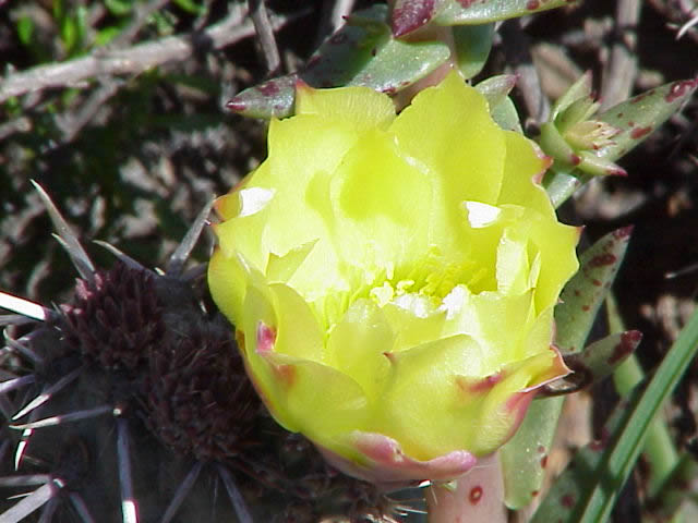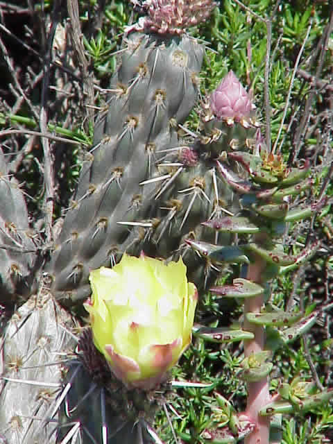 We fueled up in San Quintin, and then reached the dirt road that marks a national park and the turnoff to Meling. We climbed about 2,300 feet through some breathtaking scenery. The mountains are green and lush from the storms that dogged us for so long. The horses and cattle that we see almost everywhere look fat and happy, which is not usually the case down here. I'm used to seeing ribs on Baja horses and cows. Lovely wildflowers are blooming by the road, including yellow and orange poppies. I spotted another cactus in bloom, and we stopped to photograph it. I couldn't believe how pretty the yellow flower was. I had always heard that cactus bloom brilliantly, and now I'm a believer. I'd love to see them all in bloom.