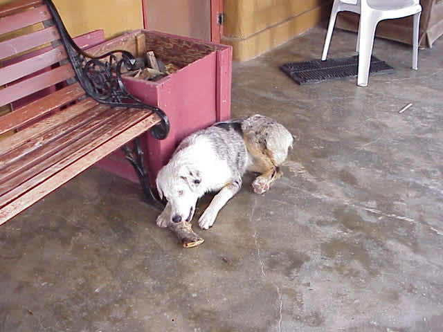 The rooms still have all the charm that I recall. My bed and dresser are a rustic Spanish mission style that I love, with a bell shape carved out of the head and footboards. I've got a real oil lamp and a little pot-bellied stove in my room, and a crate of firewood just outside the door. (The dogs love taking pieces of wood out of the crate and chewing on them.) There appears to be electricity, but the generator hasn't cranked up since we got here around noon, and it's 5 p.m. Electricity sucks up diesel, and gas is scarce on this peninsula. The sign outside Meling Ranch says "No gas!" There's also a road that passes by the ranch which heads up to an observatory. That sign also warns that there is no gas ahead, and if you don't have enough for the return trip, to "refrain from continuing."