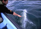 We came upon a curious whale almost immediately. Choppy slowed the motor, and waited to see if the huge gray whale would come to us. We watched as it submerged, and then appeared right next to our boat, just under the surface. The white barnacles and markings of its head began to show clearly just a few feet under the water, right next to the boat. Then we saw a huge burst of bubbles, and the whale surfaced within about three feet of our boat. We could almost touch him. The thrill sent my heart rate soaring. We scrambled around the boat to see him as he moved around us. It was incredible to be in a small boat and have such a huge creature surface right next to you.