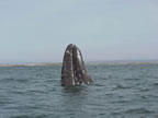We went out in a panga with our driver "Choppy" to see the whales. We had the panga to ourselves, and the weather was mild and sunny. It took about 15 minutes to get to the point where the whales congregate (and where Dad had camped before with Baja Discovery). We were seeing spouts everywhere. The large lagoon was clearly full of whales, and we headed straight into them. We didn't have to wait long for an encounter.