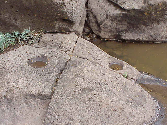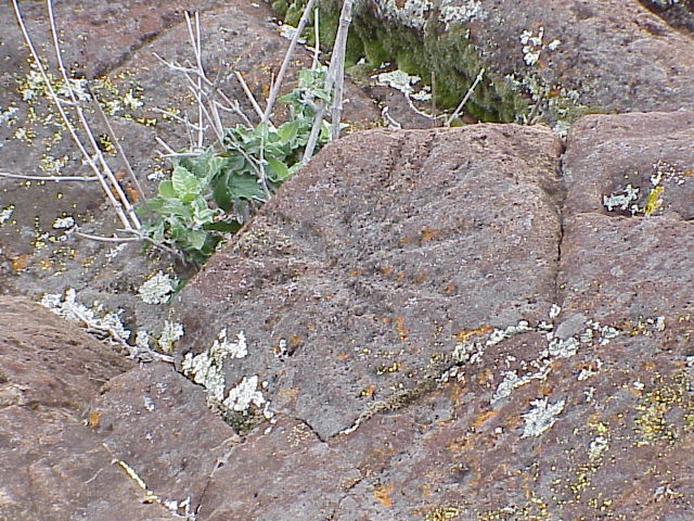 Next Raul took us to another area where we hiked a short way down into a streambed, and up the other side. We started seeing petroglyphs, or rock carvings, everywhere. Some looked like sunbursts, others like tally marks, and still others like polka dots. In the bottom of the streambed Raul showed us where the Indians would grind things in the stone. You can still clearly see the holes in the rocks. It was so pretty in the streambed, with colorful lichen and moss growing all over the rocks, and a wild fig tree growing out of the side of a rocky slope. We saw more flowers that we hadn't seen before, and lots and lots of petroglyphs. It was really a magical place.