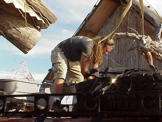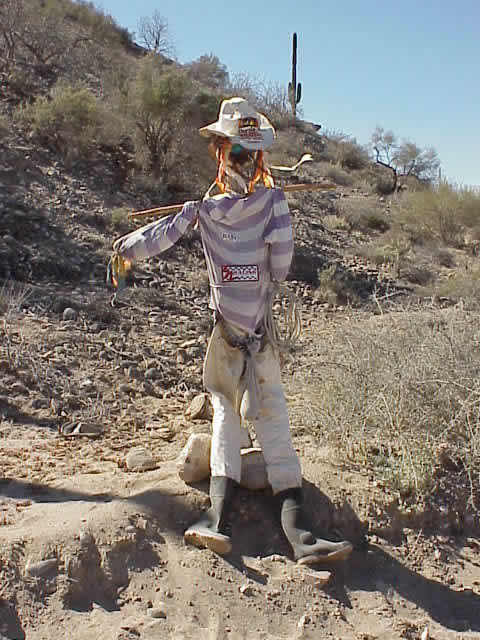 On the road we passed evidence of the types of crazy gringos who come to places like LA Bay. We came upon a strange "scarecrow" made out of Baja motocross wear, and soon after that we came upon what looked like a broken down pickup truck. This time, however, the Mexicans were not too friendly, and they waved us on, refusing our offer of help.